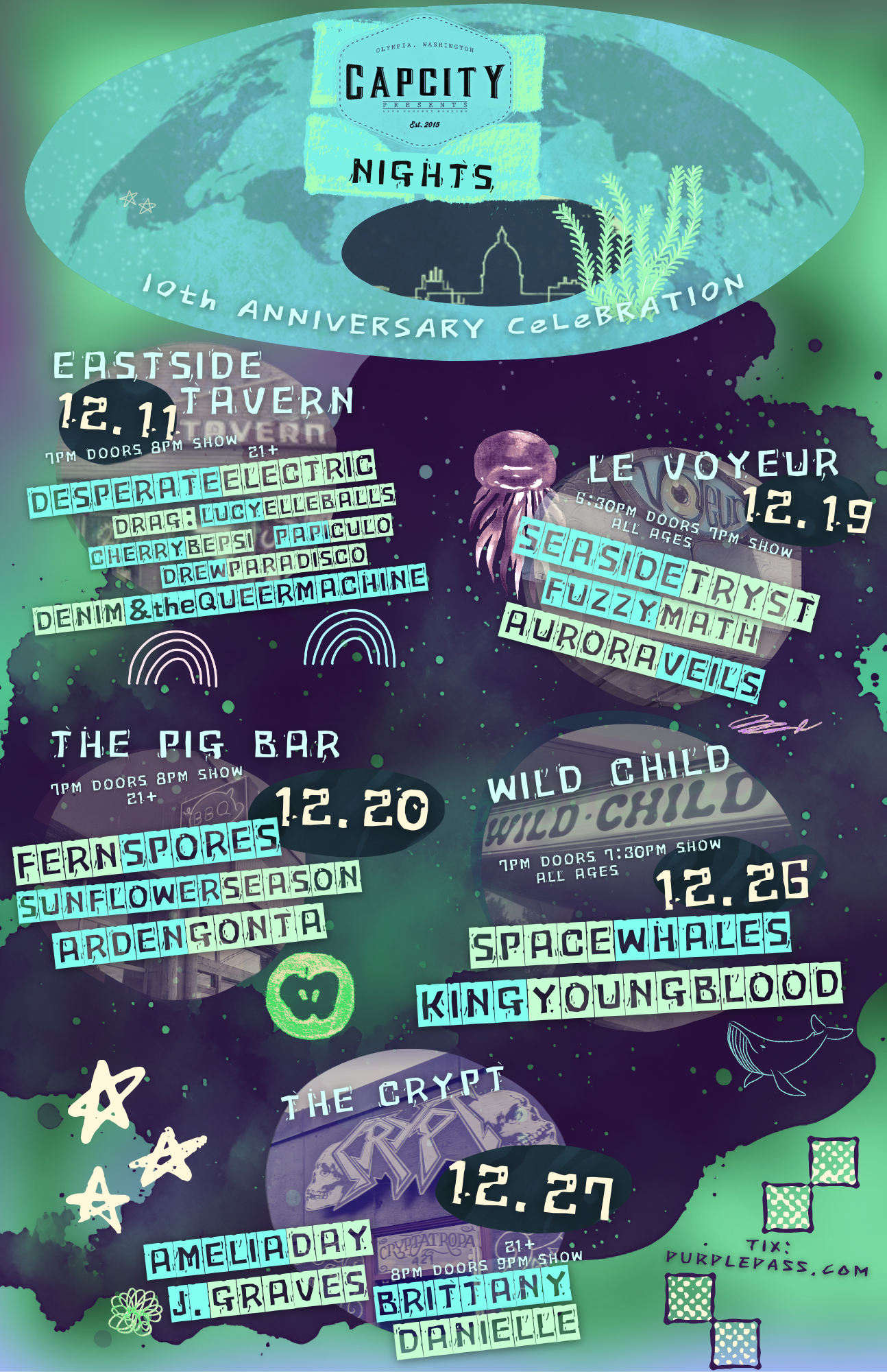 Tickets are now on sale. Two of the five nights are all ages; the rest are 21+. Get out there and see what your South Sound music scene has and support the people behind the artists. Congratulations to CapCity Presents and to Andy Moreno for ten years. Here is to another ten.