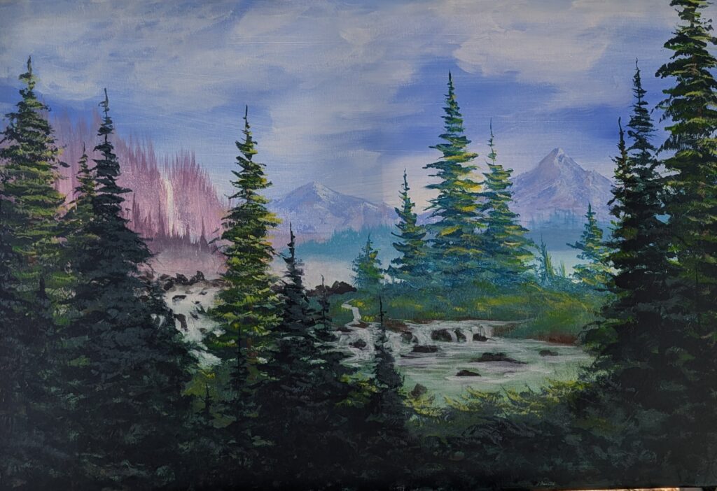 She credits many influences but refuses to attempt a full list. “Every time I try to answer this question I come up with a list that is far too long to share,” she admits. Pressed to name one, she chooses PBS’s famous art teacher circa 1983–1994: Bob Ross. “He told me I could do it. His landscapes remind me of my childhood, and he was a great teacher.”
