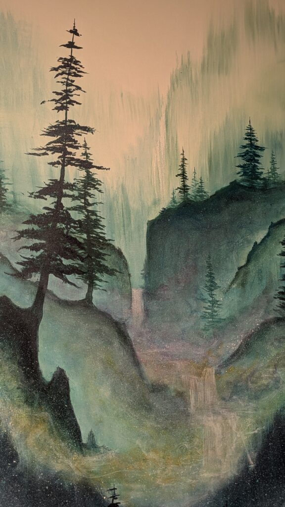 Sometimes unpredictability produces her favorite pieces. She recalls buying two oversized canvases on a steep discount. One grew into what she calls “the beast,” still unfinished, combining all her favorite elements—“a cosmic sky landscape with a giant cliff and all of my favorite things—foliage, waterfalls, and trees.” The second canvas was a gift, painted hurriedly for her brother and sister-in-law at Christmas. Working with watered-down paint and little time, she discovered unexpected textures and color layers. “I ended up getting some really cool colors and layers into it,” she says.