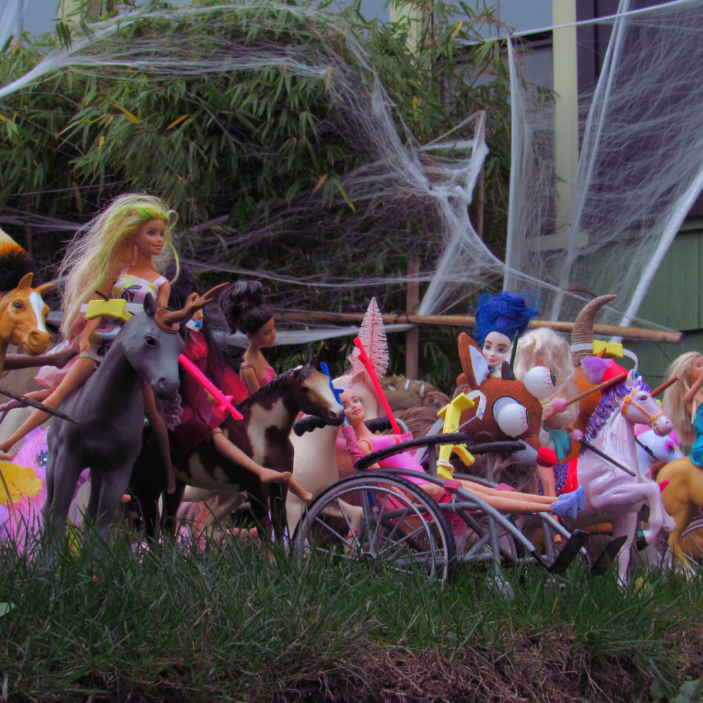 “It all started with the kids when they were young and just plastic skeletons laying on the lawn and stuff like that,” Brian says, “and it sort of evolved from there. We wanted to be artsy with stuff, so we’ve moved away from buying a lot of stuff and went the homemade route. I go to the Goodwill bins. That’s where I get a ton of stuff, and we’ve done 3D printing with the kids with the 4-H program, so then I just get ideas from different things.”