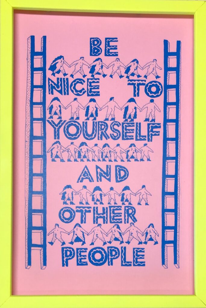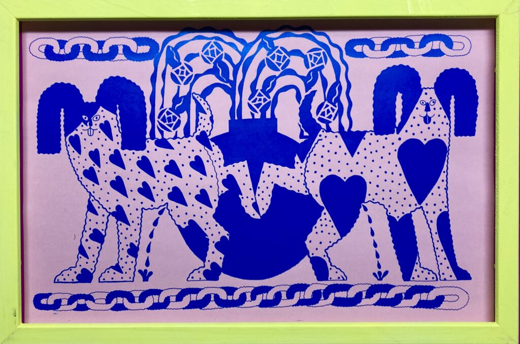 Each piece starts as a black-and-white drawing, then moves through a process involving color manipulation on photocopy machines. It’s a method she developed, refined, and is no longer possible.