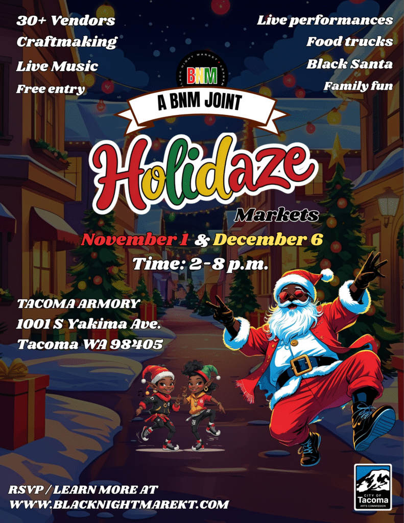 • The Tacoma Holiday Festival (formerly the Holiday Food and Gift Festival) is in town once again at the Tacoma Dome October 23 – 26. Four days of holiday twinkle and spirit, sugar and shopping all under that big dome roof. 500+ vendors will be selling their wares from truffles to laser cut trees. There are even photo opportunities with that jolly ole’ red suit and a Hallmark movie heartthrob, Tyler Hynes. Festival hours are 10am – 7pm Thursday – Saturday and 10am – 6pm Sunday. Find tickets and more information at tacomaholidayfestival.com.