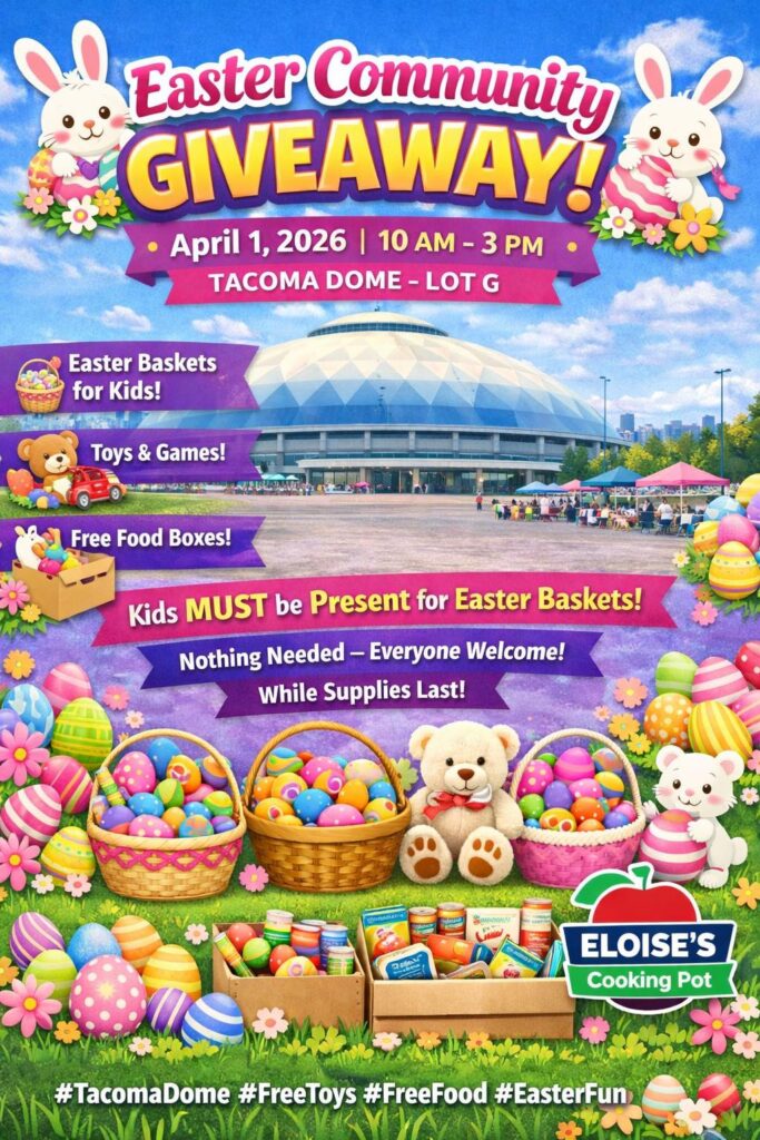 - On Easter, April 5, Shawn Tibbits will cook and host another Feed the Community drive. Volunteers and drivers are needed to help serve meals throughout Tacoma. This is the 10th annual Easter event and includes free meals available for pickup or delivery to single individuals, elders, and those experiencing homelessness. To volunteer or request a meal confidentially, email tibbittsfeast@gmail.com. Meals can be picked up from 10 a.m. to 12 p.m. at First United Methodist Church in downtown Tacoma.