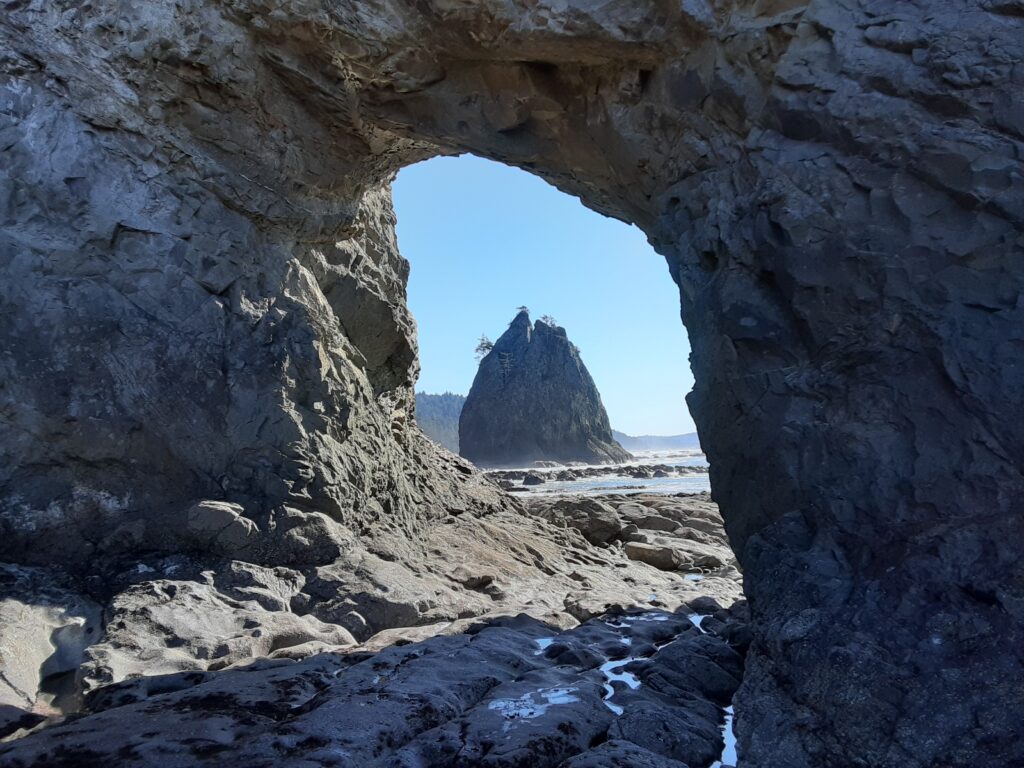 Situated just north of La Push, Rialto Beach, like Ruby Beach, is one of the coast’s most popular destinations. The two often vie for top billing. Both boast spectacular sea stacks and intriguing tide pools, but Rialto Beach has something Ruby Beach does not: a huge, dramatic opening carved through a rocky formation that allows hikers passage during low tide.